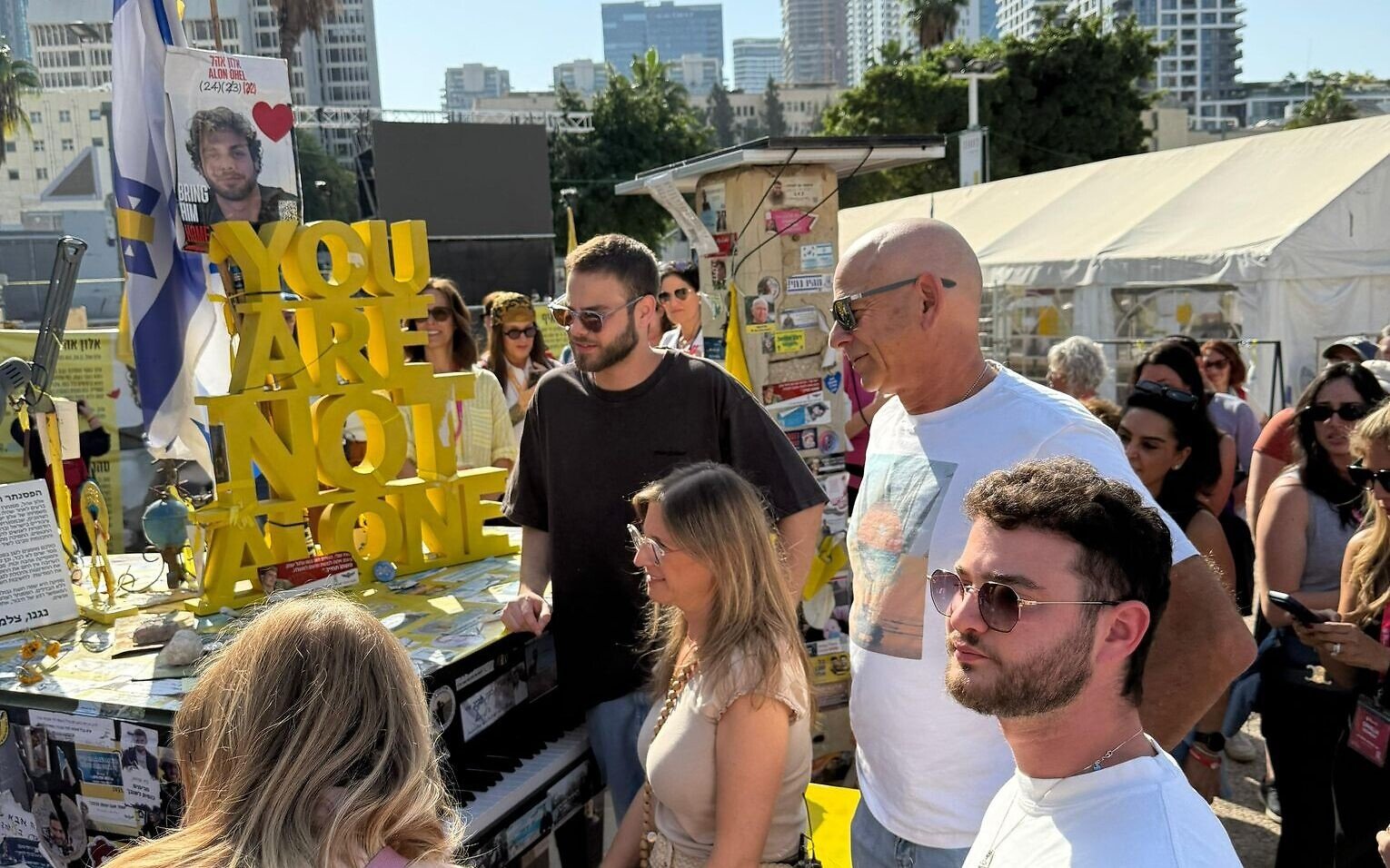 Recently freed hostage Alon Ohel played the yellow piano named for him at Hostages Square in Tel Aviv. The piano became a symbol of hope during his captivity, and Ohel is now focusing on recovery from injuries sustained during his ordeal.